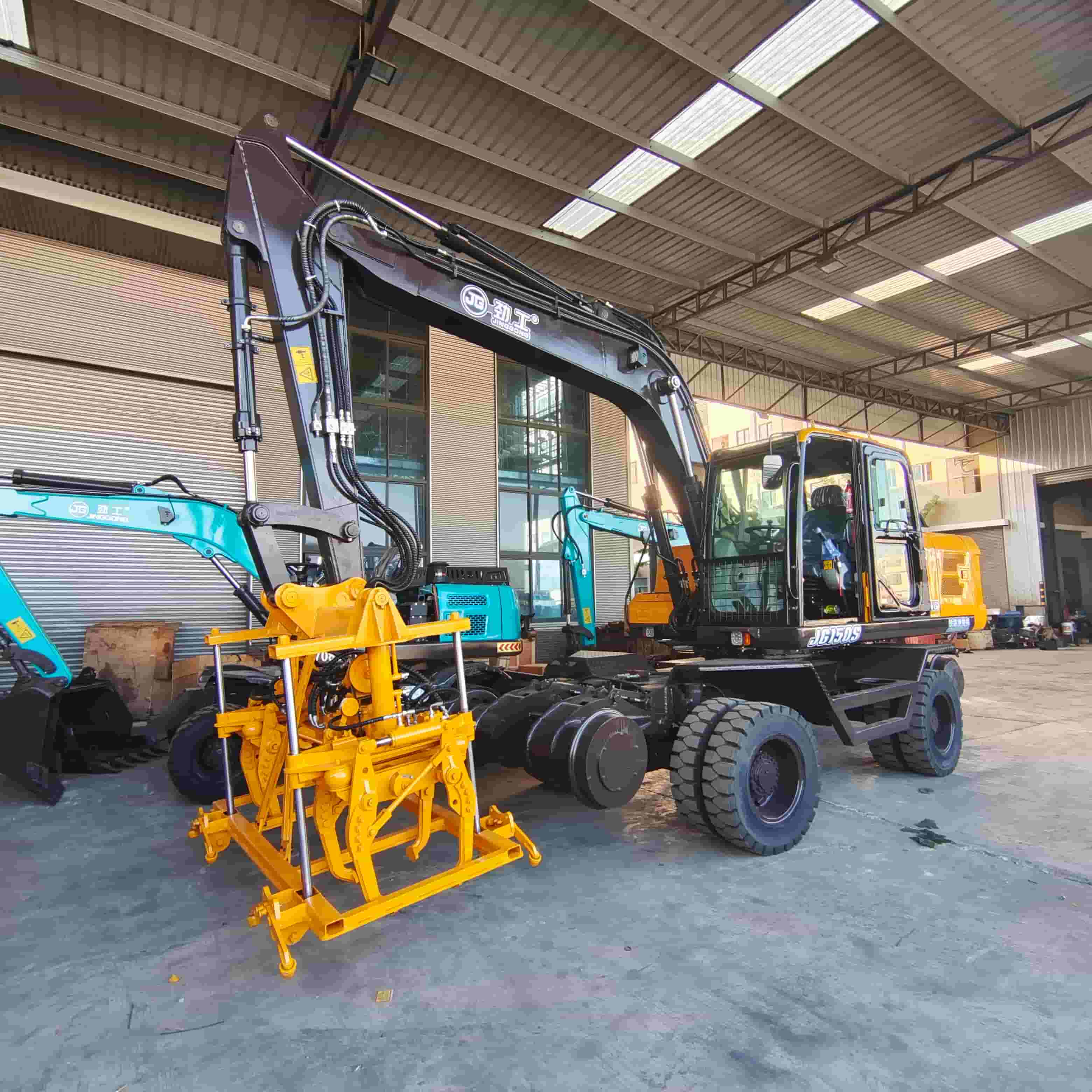 JG150S 15 टन का डबल-हेडेड रेलवे एक्सकेवेटर एक बुद्धिमान सड़क रखरखाव उपकरण है जो ट्रैक स्टैम्पिंग और मिट्टी की खुदाई को एकीकृत करता है। सामने के हाई-फ्रीक्वेंसी स्टैम्पिंग हेड और पीछे के मल्टीफंक्शनल एक्सकेवेटर आर्म के संयुक्त संचालन और रबर टायर + ट्रैक व्हील ड्यूल मोड चेसिस सपोर्ट के माध्यम से, यह जमी हुई मिट्टी, सबवे और अन्य जटिल स्थितियों में स्थिरता सुनिश्चित करता है। इससे रखरखाव दक्षता में 50% की वृद्धि होती है और श्रम लागत में 45% की बचत होती है।
